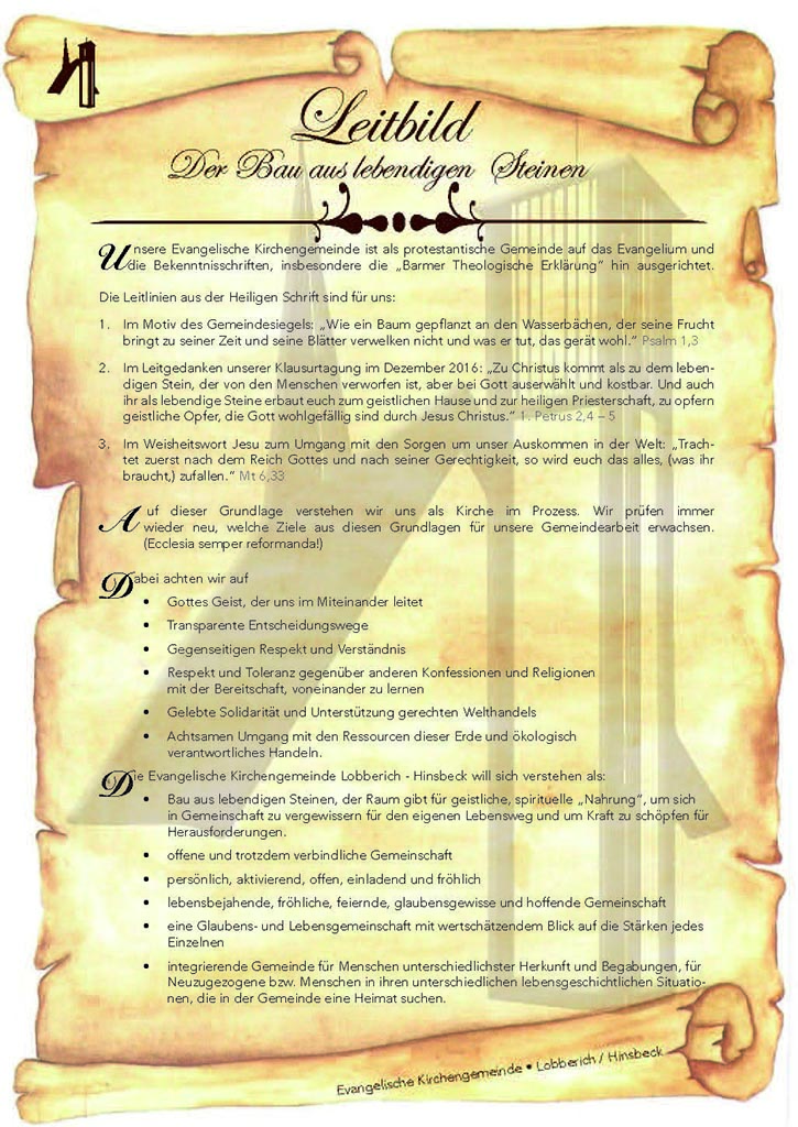 Wie Sie ja schon wissen, hat das Presbyterium im vergangenen Jahr in einer Klausurtagung  die Kernpunkte und Anliegen unserer Gemeinde formuliert. Hierzu wurde ein Leitbild erstellt. Vielfältige Aktivitäten des Aktionsbündnisses „Mach Mit“ und natürlich der Arbeitskreis für das Netzwerk NETT sind daraus hervorgegangen.