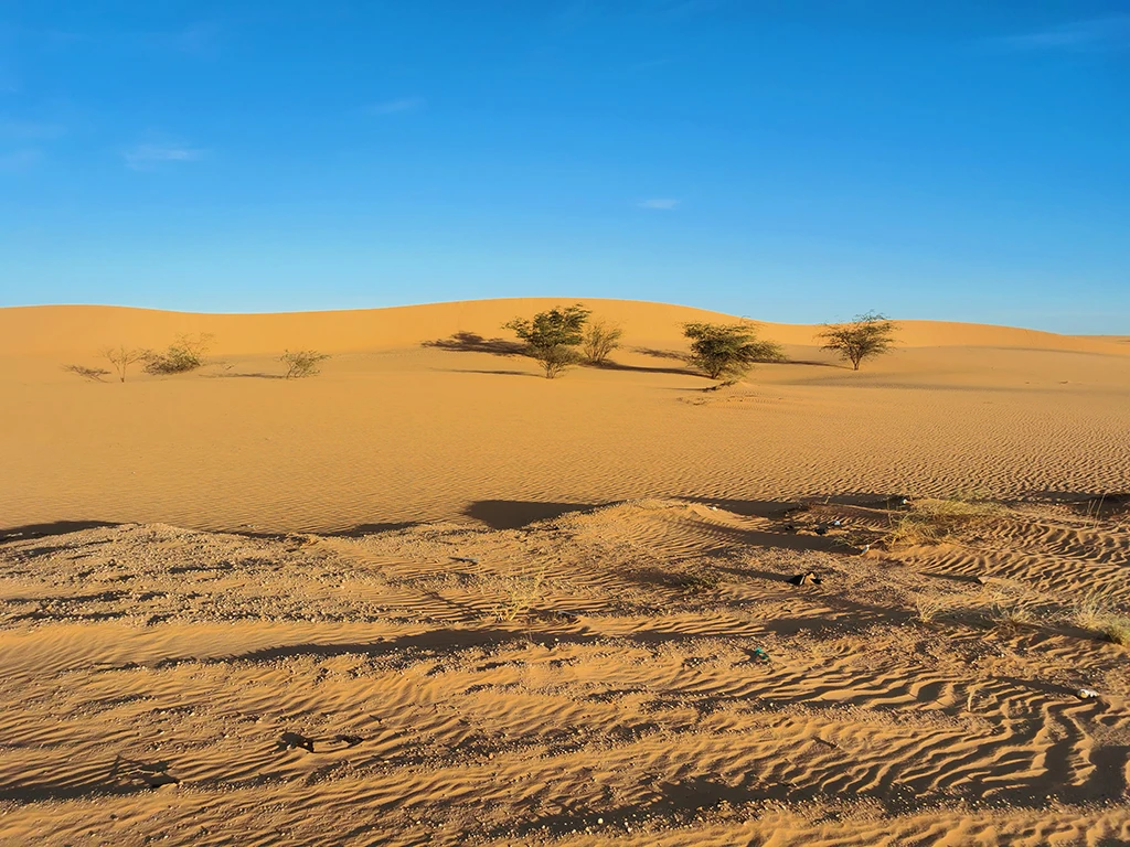 In der nächsten Nacht konnten die beiden Radfahrer wieder in einem guten Hotel übernachten. So waren sie gut gerüstet für den Grenzübertritt nach Mauretanien. Aber alles verlief problemlos. Sie mussten lediglich mehrmals ihren Pass zeigen und eine Visagebühr von 55 EUR zahlen. Es gab keine verlorenen Pässe, Bestechungsgeld war nicht nötig. Trotzdem dauerte die Prozedur recht lange, so dass es schon 14 Uhr war und die Sonne brannte.