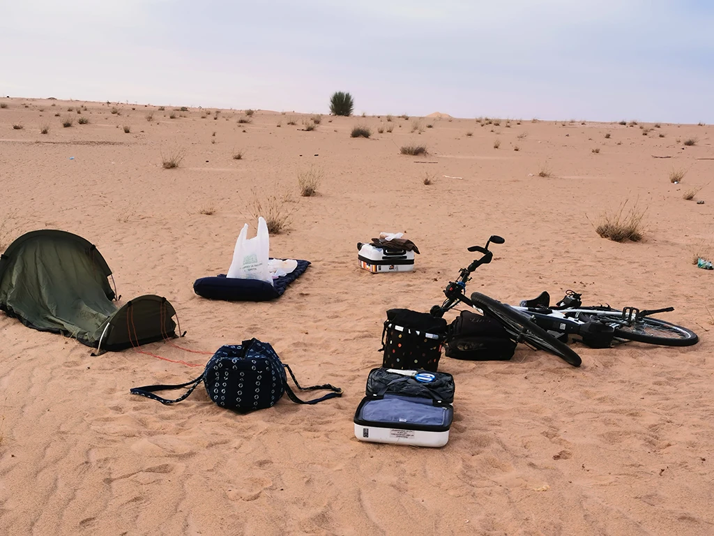 Zelt, Koffer und Fahhrad in der Wüste