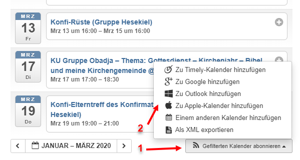 Außerdem besteht die Möglichkeit, die Termine der aktuellen Ansicht zu exportieren und Ihrem eigenen Kalender (wenn kompatibel) hinzuzufügen. Hierzu