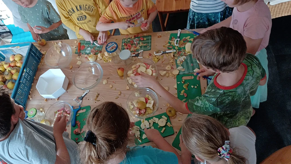 Viele Kinder um einen Tisch schneiden Äpfel und bereiten sie für das Apfelmus vor.