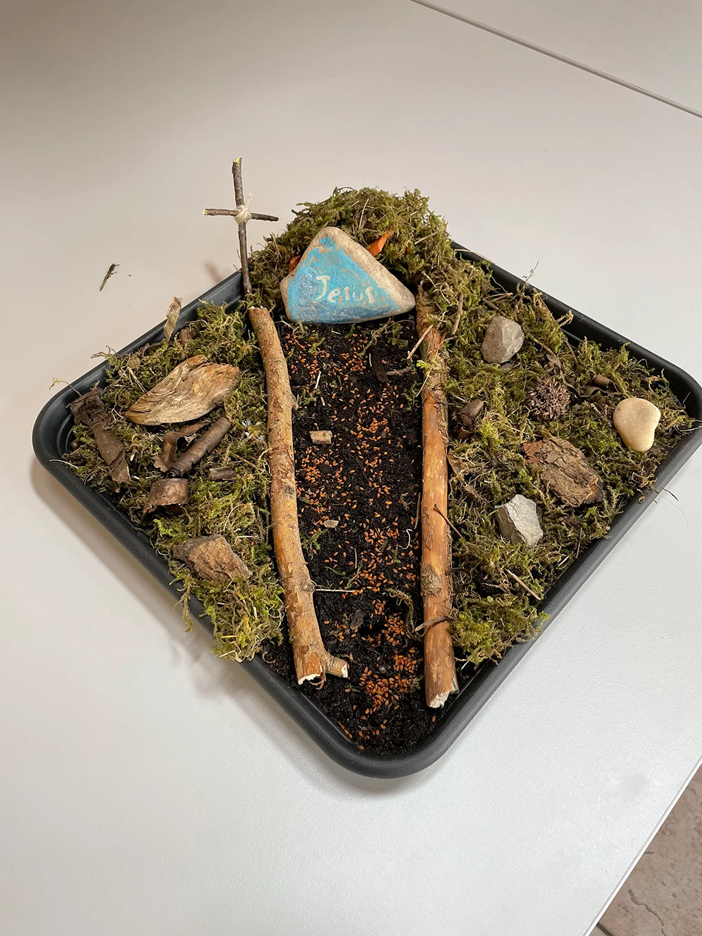 Minigarten in einer Schale mit Erde, Ästen, Moos, kleinen Steine und einem größeren Stein, auf dem "Jesus" steht.